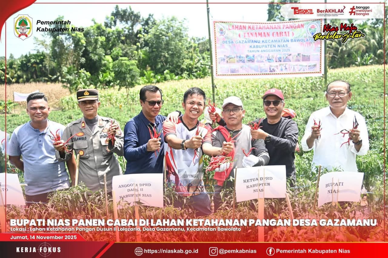 Nias – Media Fokuslensa.com – Jumat, 14 November 2025. Bupati Nias Yaatulo Gulo, S.E., S.H., M.Si bersama Wakil Bupati Nias, Ketua DPRD dan Sekretaris Daerah serta Kepala OPD melaksanakan Panen Cabai di Lahan Ketahanan Pangan Dusun II Lolozaria, Desa Gazamanu, Kecamatan Bawolato.