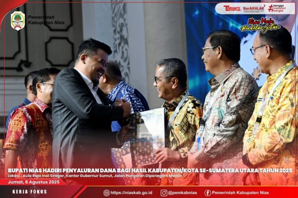 Nias – Media Fokuslensa.com – Bupati Nias, Yaatulo Gulo, S.E., S.H., M.Si menghadiri acara resmi Penyerahan Dana Bagi Hasil (DBH) Tahun 2025 untuk seluruh Kabupaten/Kota di Provinsi Sumatera Utara, bertempat Aula Raja Inal Siregar Kantor Gubernur Sumatera Utara. Jum’at (8/8/25)