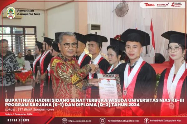 Nias – fokuslensa.com – Bupati Nias Yaatulo Gulo, S.E., S.H., M.Si hadiri Sidang Senat Terbuka Wisuda Universitas Nias (UNIAS) ke-3, Program Sarjana (S-1) dan Diploma (D3) tahun 2024, bertempat di Auditorium STT BNKP Sunderman Gunungsitoli, Sabtu (07/12/2024)