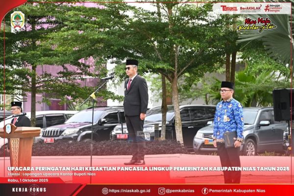 Nias – Media Fokuslensa.com – Pemerintah Kabupaten Nias menyelenggarakan Upacara Peringatan Hari Kesaktian Pancasila yang dipusatkan di Lapangan Upacara Kantor Bupati Nias, Rabu (1/10/25). Dalam kesempatan tersebut, Bupati Nias Yaatulo Gulo, S.E., S.H., M.Si bertindak sebagai Inspektur Upacara.