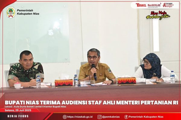Nias – Media Fokuslensa.com – Bupati Nias, Yaatulo Gulo, S.E., S.H., M.Si sambut baik audiensi dari Staf Ahli Menteri Pertanian RI, bertempat di Aula Duria Balaki Lantai II Kantor Bupati Nias. Selasa (29/7/25)