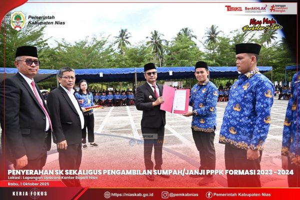 Nias – Media Fokuslensa.com – Pemerintah Kabupaten Nias menyelenggarakan kegiatan Penyerahan Keputusan Bupati Nias tentang Pengangkatan Pegawai Pemerintah dengan Perjanjian Kerja (PPPK), Pelantikan dan Pengambilan Sumpah/Janji PPPK, serta Pembukaan Orientasi Kurikulum Pengenalan Tugas dan Fungsi ASN serta Kurikulum Nilai dan Etika Instansi Pemerintah bagi PPPK Formasi Tahun 2024, Rabu (1/10/25)