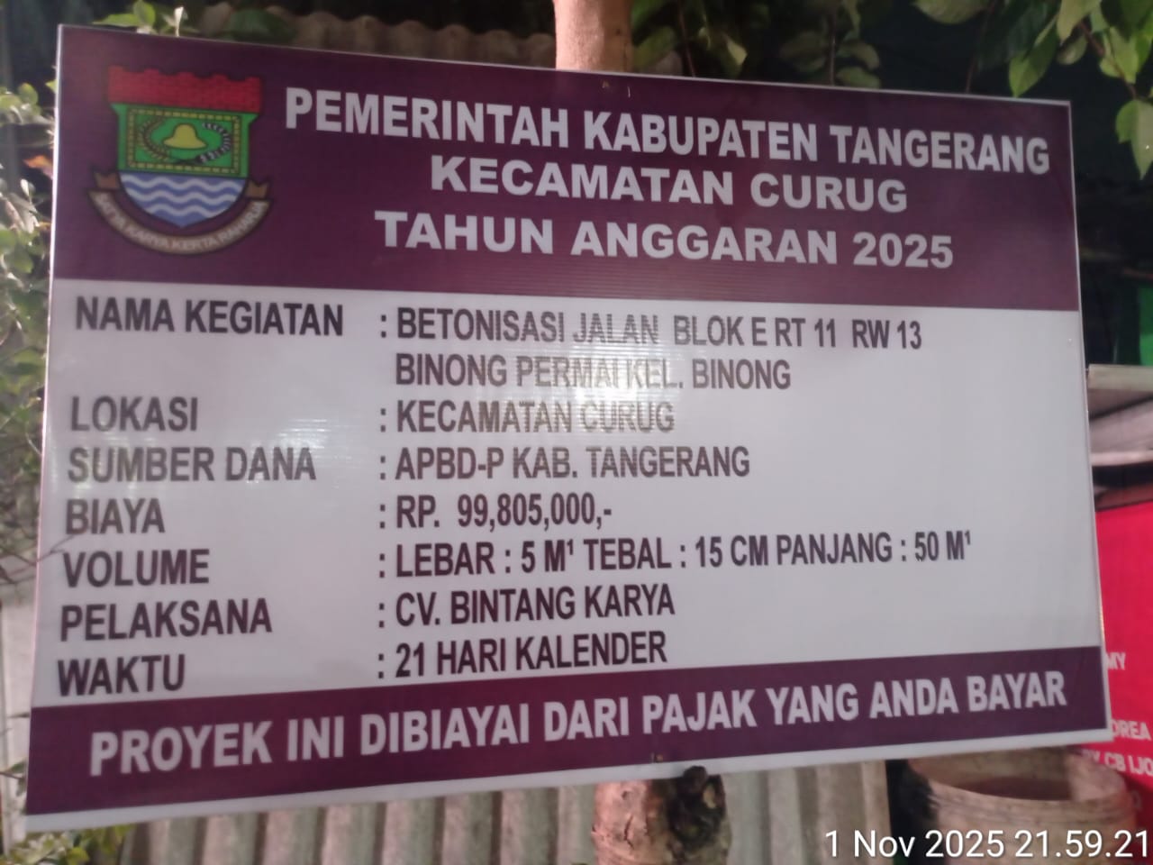 Tangerang – Media Fokuslensa.com – Betonisasi Jalan Blok E RT/11 RW/13 Binong Permai, Kelurahan Binong, Kecamatan Curug, Kabupaten Tangerang yang dilaksanakan oleh CV Bintang Karya kini mendapat sorotan tajam dari non-governmental organization Jaringan Pemberantasan Korupsi (JPK) Provinsi Banten. Senin, 03/11/2025.