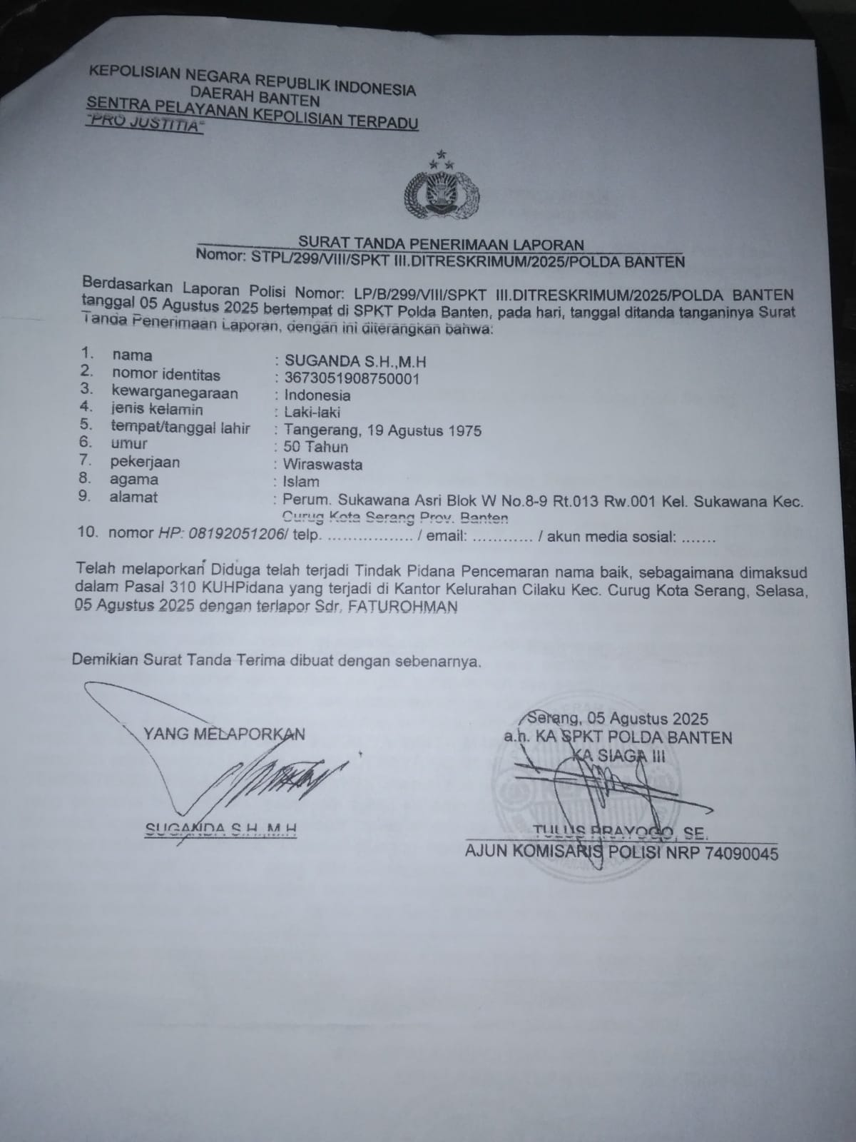 Akibat perbuatan Develover yang sok Jagoan seperti kebal hukum itu, Suganda resmi melaporkan Ke SPKT Polda Banten, dengan bukti Laporan terlampir dikenakan pasal 310 KUHP, Perbuatan Tidak Menyenangkan