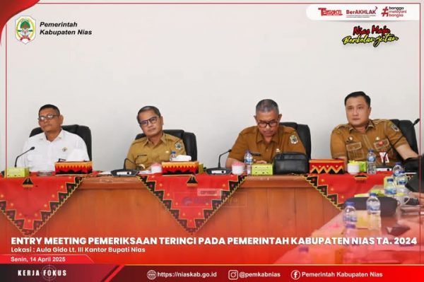 Nias – Media Fokuslensa.com – Badan Pemeriksa Keuangan (BPK RI) Perwakilan Provinsi Sumatera Utara (Prov. Sumut) menggelar kegiatan Entry Meeting dalam rangka Pemeriksaan Terinci Atas Laporan Keuangan Pemerintah Daerah (LKPD) Kabupaten Nias Tahun Anggaran 2024, bertempat di Aula Gido Lantai III Kantor Bupati Nias. Senin (14/04/25)