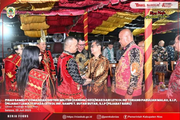Nias – Media Fokuslensa.com – Pelaksanaan Acara Pisah Sambut Komandan Distrik Militer (Dandim) 0213/Nias dari Letkol Inf Torang Parulian Malau, S.I.P, (Pejabat Lama) kepada Letkol Inf. Sampe T. Butar Butar, S.I.P (Pejabat Baru), bertempat di Pendopo Bupati Nias. Selasa (29/7/25)