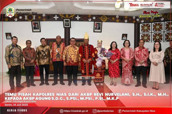 Nias – Media Fokuslensa.com – Pelaksanaan Acara Temu Pisah Kapolres Nias dari AKBP Revi Nurvelani, S.H., S.I.K., M.H (Pejabat Lama) kepada AKBP Agung S.D.C., S.PSI., P.SI., M.K.P (Pejabat Baru), bertempat di Pendopo Bupati Nias. Senin (14/7/25)