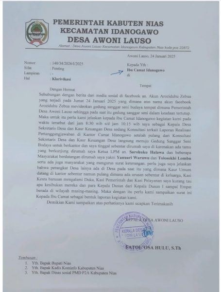 Pada surat yang dialamatkan kepada Ibu Camat Idanogawo tersebut, kepala Desa Awoni Lauso, Fatou’osa Hulu menjelaskan dari pukul 08.30 s/d 10.30, kepala desa bersama dengan sekretaris desa dan Kaur Keuangan sedang konsultasi terkait laporan realisasi pertanggungjawaban di kantor camat Idanogawo.
