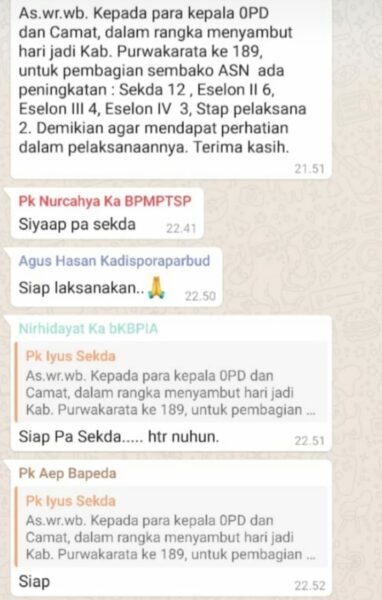 Seperti screen shoot Whatapps yang diterima awak media BU, berbunyi Sekretaris Daerah (Sekda) Kabupaten Purwakarta yang ditujukan kepada para Kepala OPD dan Camat, dalam rangka peringatan hari jadi Kabupaten Purwakarta ke 189, pembagian sembako ASN ada peningkatan yakni Sekda 12, Eselon II 6, Eselon III 4, Eselon IV 3, staf pelaksana 2, demikian agar dapat perhatian dalam pelaksanaannya.