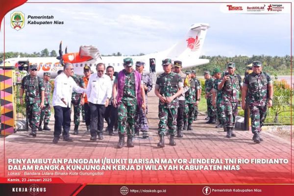 Nias – fokuslensa.com – Wakil Bupati Nias sambut kedatangan Pangdam I/Bukit Barisan, Mayor Jenderal TNI Rio Firdianto di Wilayah Kabupaten Nias, bertempat di Bandar Udara Binaka-Gunungsitoli. Usai penyambutan, seluruh rombongan menuju Ruang VVIP Bandar Udara Binaka, Kamis (23/01/2025)
