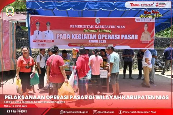 Nias -Media Fokuslensa.com – Pemerintah Kabupaten Nias melalui Dinas Koperasi UKM, Perdagangan dan Ketenagakerjaan Kabupaten Nias gelar Operasi Pasar menjelang Hari Besar Keagamaan (Hari Raya Idul Fitri 1446 H) di Desa Tetehosi, Kecamatan Idanogawo. Rabu (12/03/25)