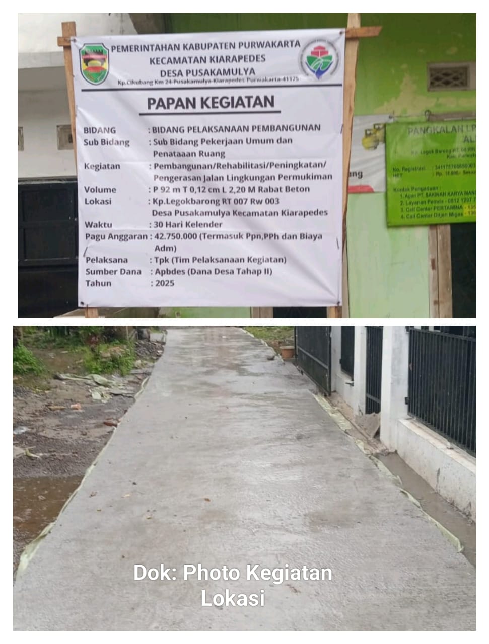 Purwakarta | Media Fokuslensa.com – Pemerintah Desa Pusakamulya, Kecamatan Kiarapedes, Kabupaten Purwakarta, mulai melaksanakan pembangunan rabat beton jalan lingkungan di Kampung Legokbarong RT 007 RW 003. Proyek ini merupakan bagian dari program Dana Desa (APBDes Tahap II) tahun anggaran 2025.
