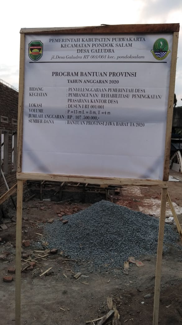 Pembangunan Rehabilitasi Peningkataan kantor desa Tepatnya di Dusun 1 RT 001/ 001 dengan volume P = (13 )Meter, L (8)Meter, T (4)Meter tersebut, dibiayai dari Dana Bantuan Provinsi Jawa Barat Tahun Anggaran TA 2020 sebesar Rp. 107.500.000.Juta, dengan pelaksanaan pembangunannya dilakukan secara swakelola oleh masyarakat setempat.