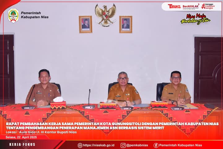 Nias – Media Fokuslensa.com – Tim Koordinasi Kerja Sama Daerah (TKKSD) Kabupaten Nias dan Tim Koordinasi Kerja Sama Daerah (TKKSD) Kota Gunungsitoli gelar pertemuan dalam rangka membahas kerjasama antara Pemerintah Kota Gunungsitoli dengan Pemerintah Kabupaten Nias yang substansinya tentang rencana Kerja Sama Pengembangan Penerapan Manajemen ASN Berbasis Sistem Merit, bertempat di Aula Gido Lantai III Kantor Bupati Nias. Selasa ((22/04/25)
