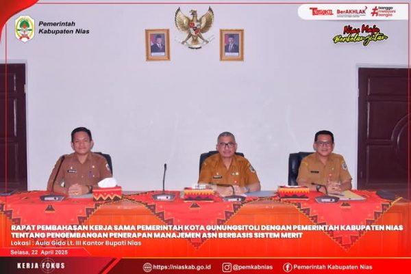 Nias – Media Fokuslensa.com – Tim Koordinasi Kerja Sama Daerah (TKKSD) Kabupaten Nias dan Tim Koordinasi Kerja Sama Daerah (TKKSD) Kota Gunungsitoli gelar pertemuan dalam rangka membahas kerjasama antara Pemerintah Kota Gunungsitoli dengan Pemerintah Kabupaten Nias yang substansinya tentang rencana Kerja Sama Pengembangan Penerapan Manajemen ASN Berbasis Sistem Merit, bertempat di Aula Gido Lantai III Kantor Bupati Nias. Selasa ((22/04/25)