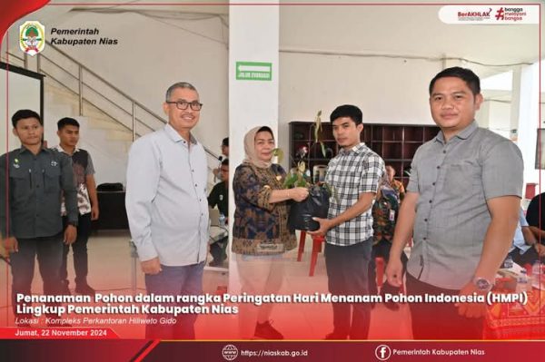 Nias – Media Fokuslensa.com – Pemerintah Kabupaten Nias gelar Peringatan Hari Menanam Pohon Indonesia (HMPI) yang dirangkai dengan Penyerahan Bibit Durian dan Alpukat di Lingkungan Pemerintah Kabupaten Nias Tahun 2024, bertempat di Kompleks Perkantoran Hiliweto-Gido, Jum’at (22/11/2024)