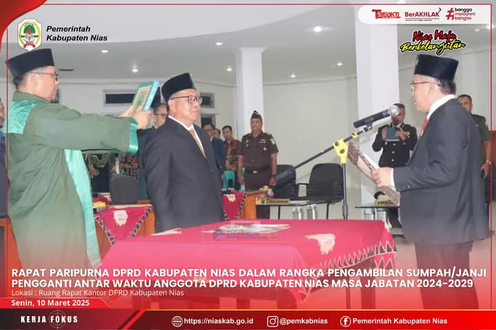 “Atas Nama Pemerintah Kabupaten Nias, kami menyambut baik pengambilan sumpah/janji saudara Alfrin Zebua sebagai Anggota DPRD Kabupaten Nias pengganti antar waktu dari Partai Golkar, sebagai tindak lanjut dari Keputusan Gubernur Sumatera Utara Nomor 188.44/208/KPTS/2025 Tanggal 5 Maret 2025 tentang Peresmian Pemberhentian dan Pengangkatan Pengganti Antarwaktu Anggota Dewan Perwakilan Rakyat Daerah Kabupaten Nias” Ujar Wakil Bupati Nias.