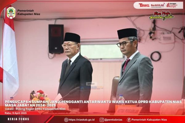 Nias – Media Fokuslensa.com – Bupati Nias, Yaatulo Gulo, S.E., S.H., M.Si hadiri Pengucapan Sumpah/janji Pengganti Antarwaktu Wakil Ketua DPRD Kabupaten Nias Masa Jabatan 2024-2029, bertempat di Ruangan Rapat DPRD Kabupaten Nias. Rabu (9/4/25)