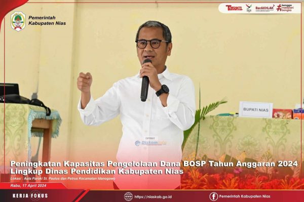 Kepala Dinas Pendidikan Kabupaten Nias, Drs. Kharisma Halawa, M.Si melaporkan bahwa kegiatan tersebut bertujuan agar Pengelolaan, Perencanaan, Penganggaran, Penatausahaan serta Pelaporan dan Pertanggungjawaban Dana BOSP Tahun anggaran 2024 di Kabupaten Nias dapat terlaksana dengan Efektif, Efisien, Akuntabel dan Transparan.
