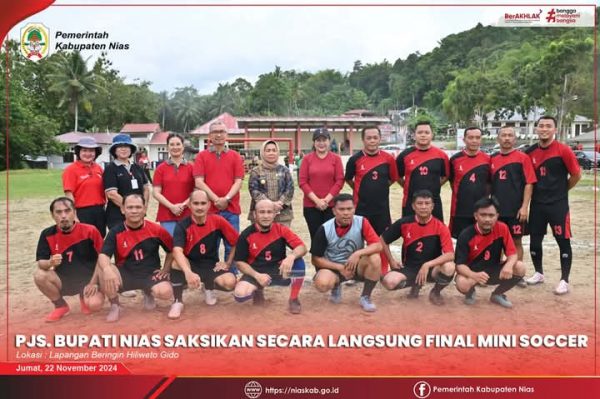 Hari ini, Pjs Bupati Nias dengan didampingi oleh Sekretaris Daerah Kabupaten Nias, Kepala Perangkat Daerah Kabupaten Nias, Ketua DWP Kabupaten Nias serta ASN lingkup Pemerintah Kabupaten Nias dan masyarakat sekitar saksikan secara langsung partai Final Mini Soccer, Jum’at (22/11/2024)