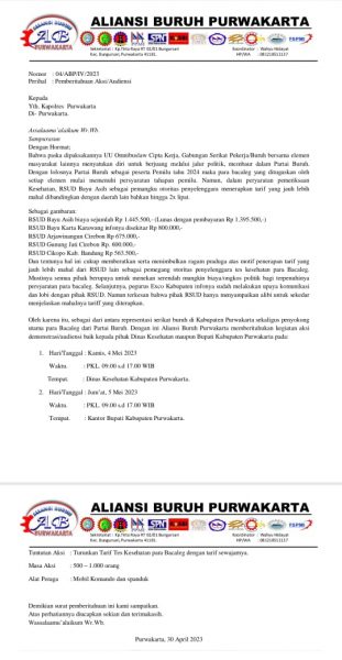 Surat aksi yang dilayangkan oleh Aliansi Buruh Purwakarta menyoal penerapan tarif tes kesehatan bakal calon legislatif di RSUD Bayu Asih Purwakarta yang jauh lebih mahal dari RSUD RSUD lainnya.