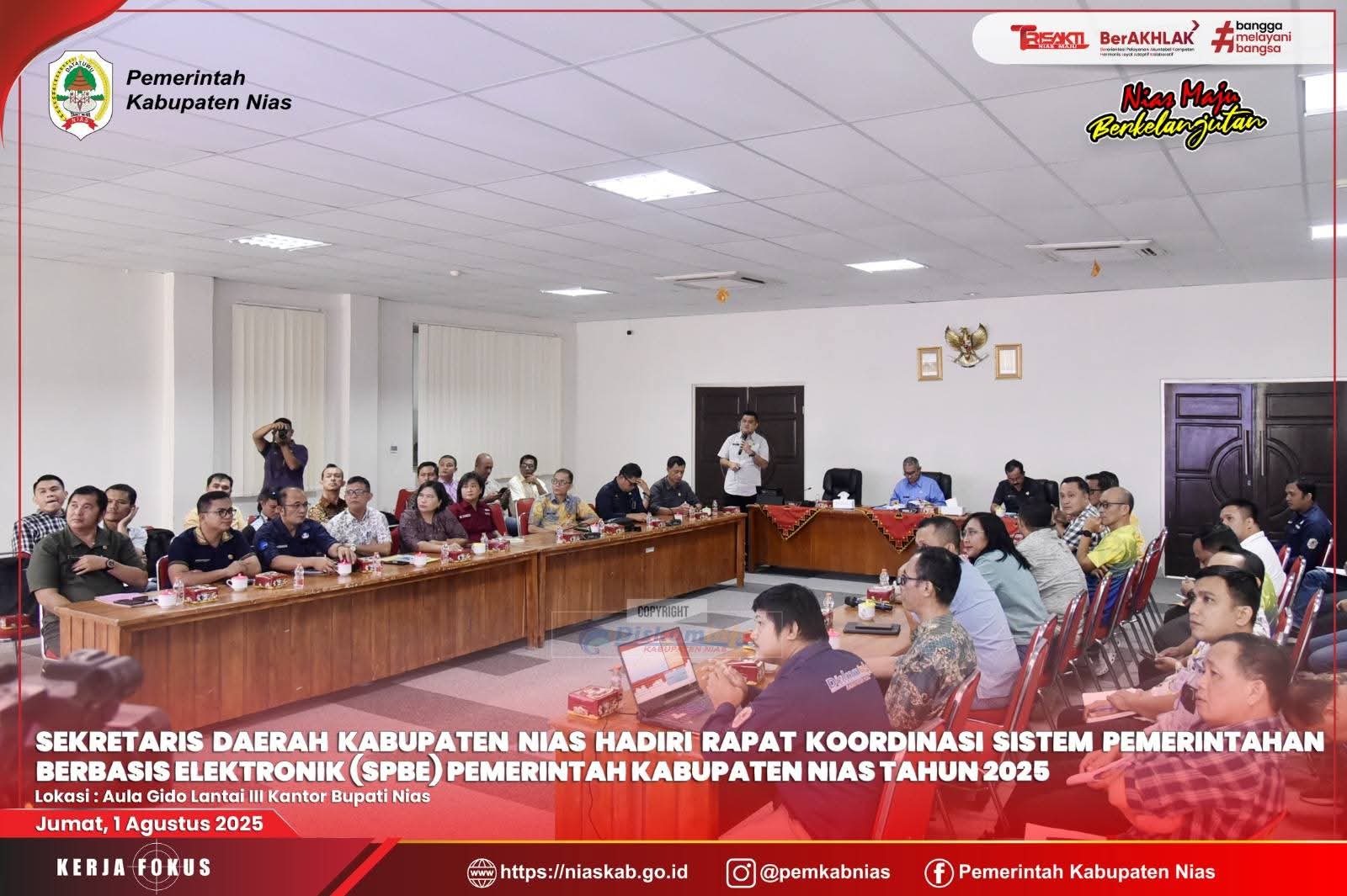 Nias – Media Fokuslensa.com – Pemerintah Kabupaten Nias melalui Dinas Komunikasi dan Informatika Kabupaten Nias menggelar Rapat Koordinasi Sistem Pemerintahan Berbasis Elektronik (SPBE) di Lingkungan Pemerintah Kabupaten Nias, bertempat di Aula Gido Lantai III Kantor Bupati Nias. Jumat (01/8/25)