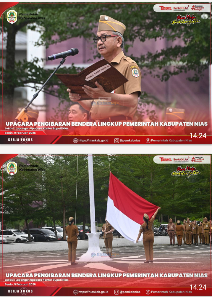 Nias – Media Fokuslensa.com – Senin, 09 Februari 2026. Pemerintah Kabupaten Nias melaksanakan Upacara Pengibaran Bendera Merah Putih, bertempat di Lapangan Upacara Kantor Bupati Nias.