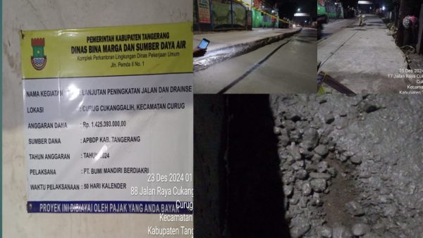 Tangerang – Media Fokuslensa.com – Proyek lanjutan peningkatan jalan dan drainase Curug Cukanggalih, Kecamatan Curug yang dilaksanakan oleh PT. Bumi Mandiri Berdikari dengan nilai anggaran sebesar Rp. 1.425.393.000,- diduga dikerjakan tidak sesuai Rencana Anggaran Biaya (RAB). Rabu, 25/12/2024.