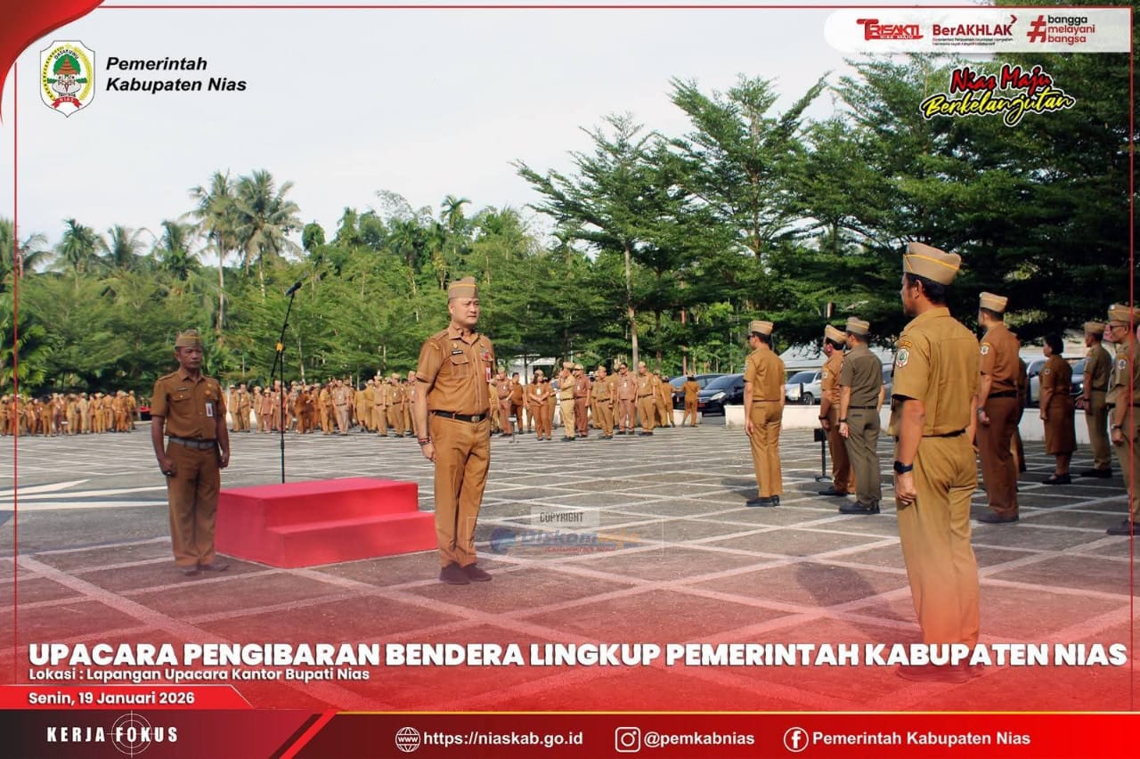 Nias – Media Fokuslensa.com – Senin, 19 Januari 2026 – Pemerintah Kabupaten Nias melaksanakan Upacara Pengibaran Bendera Merah Putih yang berlangsung di Lapangan Upacara Kantor Bupati Nias. Upacara dipimpin oleh Kepala Badan Kesatuan Bangsa dan Politik (Kesbangpol) Kabupaten Nias, Andhika P. Laoly, SSTP., M.Si., CGCAE, dengan petugas upacara dari ASN Kesbangpol Kabupaten Nias, serta diikuti oleh Staf Ahli Bupati, Asisten Sekretaris Daerah, Kepala Perangkat Daerah, Kepala Bagian, dan seluruh ASN di lingkungan Pemerintah Kabupaten Nias.
