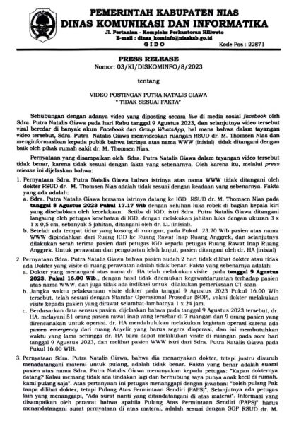 Berdasarkan penjelasan tersebut di atas, dengan ini ditegaskan bahwa pernyataan yang disampaikan oleh Sdra. Putra Natalis Giawa melalui tayangan video yang di posting secara live di media sosial Facebook pada hari Rabu tanggal 9 Agustus 2003 adalah tidak benar dan tidak sesuai dengan keadaan atau fakta yang sebenarnya, dan tayangan video tersebut telah mencemarkan dan merugikan nama baik RSUD dr. M. Thomsen Nias, termasuk perawat dan dokter yang menangani. Perawat dan dokter yang menangani RSUD dr. M. Thomsen Nias telah memberikan pelayanan yang baik sesuai dengan Standar Operasional Prosedur (SOP) kepada pasien atas nama www, istri dari Sdra. Putra Natalis Giawa.