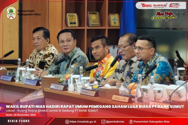 Nias – Media Fokuslensa.com – Senin, 24 November 2025. Wakil Bupati Nias Arota Lase, A.Md menghadiri Rapat Umum Pemegang Saham Luar Biasa (RUPSLB) PT Bank Sumut, bertempat di Ruang Rapat Direksi Lantai III Gedung PT Bank Sumut, Medan.