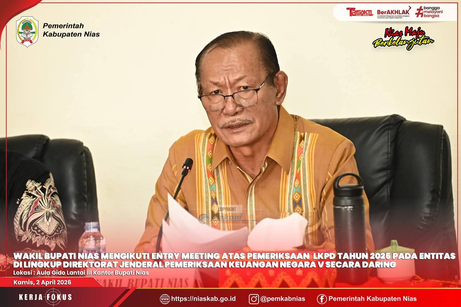 Nias – Media fokuslensa.com – Kamis, 02 April 2026. Wakil Bupati Nias, Arota Lase, A.Md mengikuti Entry Meeting atas Pemeriksaan Laporan Keuangan Pemerintah Daerah (LKPD) Tahun 2025 pada entitas di lingkup Direktorat Jenderal Pemeriksaan Keuangan Negara V Badan Pemeriksa Keuangan Republik Indonesia secara daring dari Aula Gido Lantai III Kantor Bupati Nias. Kegiatan ini dipimpin langsung oleh Direktur Jenderal Pemeriksaan Keuangan Negara V, Widhi Widayat, S.E., M.Si., Ak., CA., CSFA., CFrA., ERMAP., GRCP., GRCA.