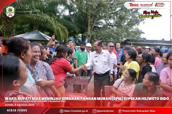 Nias – Media Fokuslensa.com – Wakil Bupati Nias, Arota Lase. A.Md meninjau Gerakan Pangan Murah (GPM) yang difasilitasi oleh Dinas Ketahanan Pangan, Pertanian dan Perikanan Kabupaten Nias dalam rangka Stabilisasi Pasokan dan Harga Pangan di Kabupaten Nias Tahun 2025, bertempat di Pekan Hiliweto Gido. Jum’at (8/8/25)