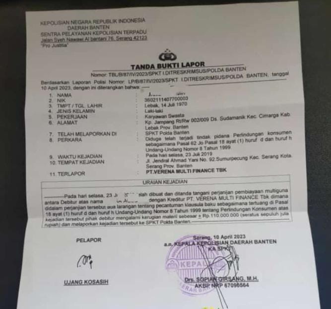 Tim Penasehat Hukum yang dipimpin Moch. Anssory berkordinasi dengan para Ketua Umum Ikatan LPKSM Indonesia (ILI) membahas terkait temuan pelanggaran pencantuman klausul baku dalam perjanjian antara LA dan PT. Verena Finance Tbk, maka pada hari Senin tanggal 10 April 2023, Tim Penasehat Hukum LA mendatangi SPKT Polda Banten Untuk melaporkan tindak pidana pelanggaran Undang-Undang Nomor 8 Tahun 1999 Tentang Perlindungan Konsumen.
