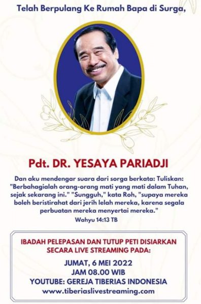 Dari lubuk hati yang paling dalam izin saya Sekjen Organisasi AWDI B Wadja .S.SH juga sebagai Pendiri Gereja TIBERIAS Mengucapkan Ikut Turut Berbelasungkawa yang sedalam-dalamnya atas Wafatnya Pemimpin yang patut di teladani Pdt.Dr.Yesaya Pariadji