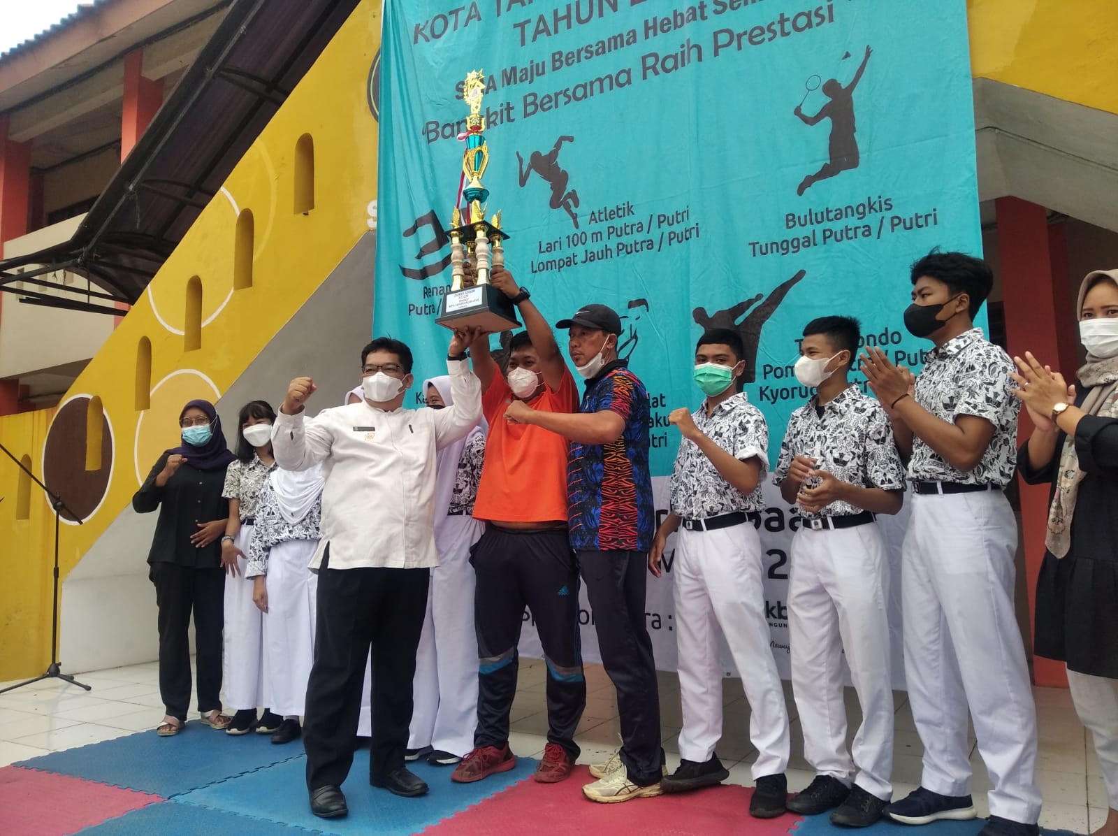 Tangerang Selatan” – Fokuslensa.com – Kegiatan Peserta KOSN tahun 2022 Olimpiade olahraga sekolah menengah atas SMA Negeri dan Swasta tingkat KotaTangsel perlombaan pada tanggal 27 sampai 29 Maret 2022, acara pembagian piala dihalaman Sekolah SMAN 7 Kota Tangerang Selatan pada Jumat (1/4/2022)