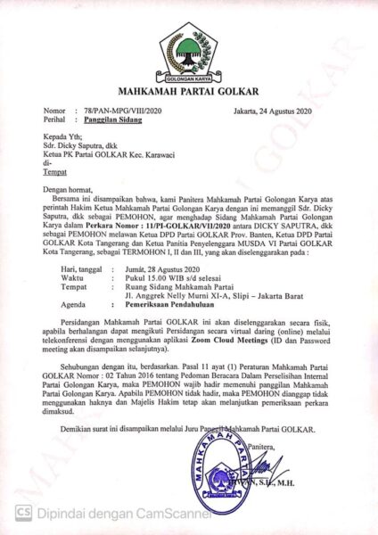 Pembacaan sidang Mahkamah Partai Golkar itu sesuai dengan surat panggilan Sidang kepada Dicky Saputra dkk dengan nomor Surat 78/PAN-MPG/VIII/2020.