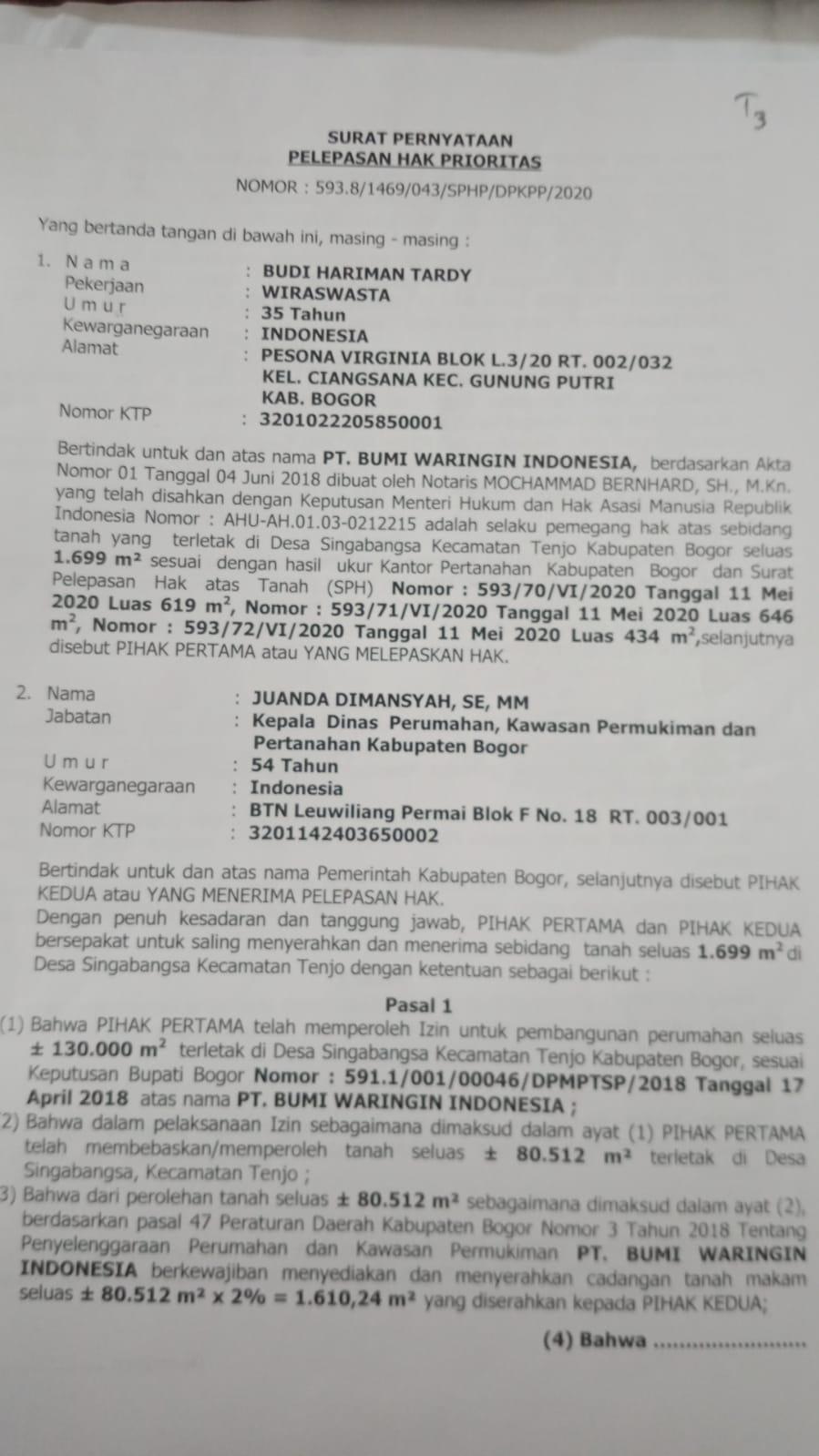 Dugaan warga bukan tanpa dasar. Berdasarkan dokumen Surat Pernyataan Pelepasan Hak Prioritas bernomor: 593.8/1469/043/SPHP/DPKPP/2020, disebutkan bahwa PT. Bumi Waringin Indonesia — pengembang Perumahan Tenjo City — berkewajiban menyediakan dan menyerahkan cadangan tanah makam seluas 1.610,24 m² kepada Pemerintah Kabupaten Bogor.