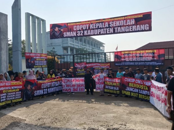 Kabupaten Tangerang – Media Fokuslensa.com – Ratusan warga dari beberapa desa di Kabupaten Tangerang, termasuk Desa Curug Wetan, Desa Rancagong, dan Desa Serdang Wetan, yang tergabung dalam Aliansi Masyarakat Bersatu, bersama sejumlah aktivis LSM, menggelar aksi unjuk rasa di depan gerbang SMA Negeri 32 Kabupaten Tangerang. Selasa. 12/7/2025.