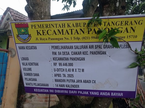 Tangerang – Media Fokuslensa.com – Proyek pemeliharaan saluran air (SPAL) Graha Reflesia, RW/04 Desa Ciakar, Kecamatan Panongan, Kabupaten Tangerang yang dilaksanakan oleh CV Mandiri Putra Jaya Abadi yang diduga tidak sesuai spesifikasi, standar maupun kualitasnya kini berbuntut panjang. Rabu, 22/10/2025.