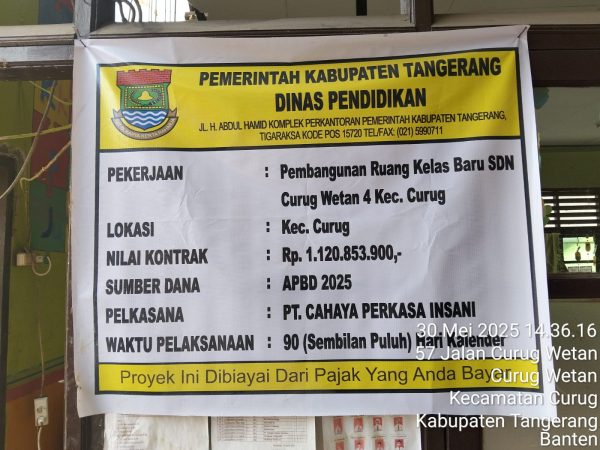 Tangerang – Media Fokuslensa.com – Pembangunan ruang kelas baru SDN Curug Wetan 4, Kecamatan Curug, Kabupaten Tangerang dengan nilai anggaran sebesar Rp.1.120.853.900,- yang dilaksanakan oleh PT. Cahaya Perkasa Insani diduga menggunakan besi banci kini berbuntut panjang. Senin, 02/06/2025.