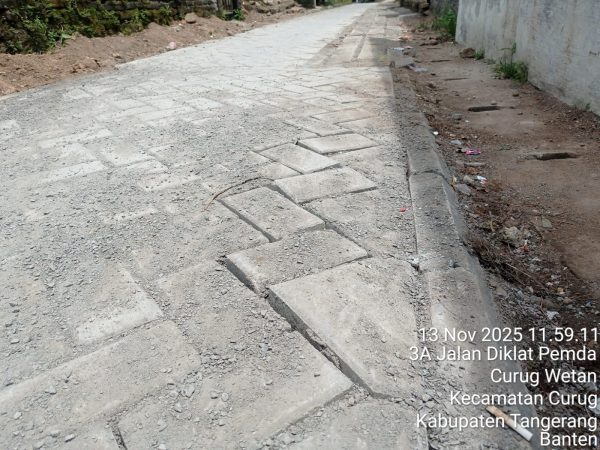 Tangerang – Media Fokuslensa.com –Peningkatan jalan paving block di RT/03 RW/02 Desa Curug Wetan, Kecamatan Curug, Kabupaten Tangerang yang dilaksanakan oleh CV Aprisa Pembangunan Lestari diduga tidak sesuai dengan spesifikasi, standar maupun kualitasnya. Kamis, 13/11/2025.
