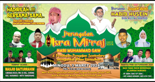 Tangerang – Fokuslensa.com – Memperingati Isra Mi’raj Nabi Muhammad SAW Dan Penutupan Pengajian Masjid Baiturrah, Tangerang | Isra Miraj merupakan salah satu peristiwa bersejarah yang sangat agung dan penting bagi umat Islam, saat Nabi Muhammad SAW menerima perintah langsung dari Allah SWT untuk melaksanakan salat wajib 5 kali dalam sehari semalam. Minggu, 03/03/2024.