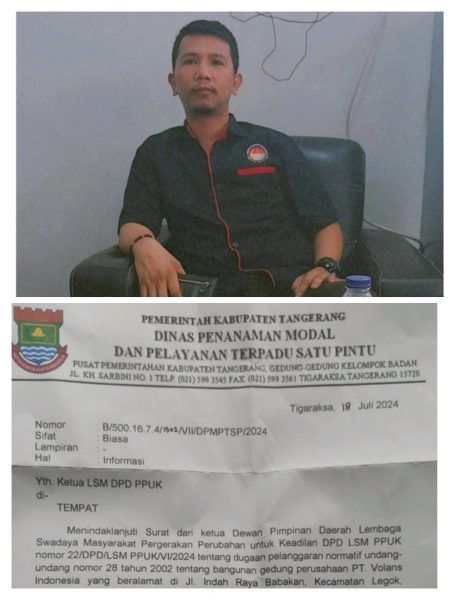 Kabupaten Tangerang – Media Fokuslensa.com – LSM PPUK DPD Provinsi Banten kembali membuat gebrakan terhadap perusahaan yang diduga belum memiliki perizinan, sebuah perusahaan dengan nama PT.Volans Indonesia itu menurut ketua LSM PPUK DPD Banten Septrian ketika pihaknya bersama tim investigasi lapangan mencari kebenaran akan perizinan diduga perusahaan tersebut belum memiliki perizinan lengkap, Selasa 30 Juli 2024.
