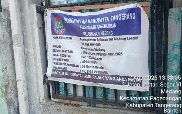 Tangerang – Media Fokuslensa.com – Proyek peningkatan saluran air U-Ditch di RT/05 RW/09 Medang Lestari, Kecamatan Pagedangan yang dilaksanakan oleh CV Tiga Perkasa diduga tidak sesuai dengan spesifikasi, standar dan kualitasnya kini berbuntut panjang. Senin, 04/08/2025.