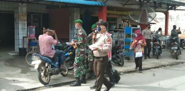 Mempawah, Kalimantan Barat – Fokuslensa.com – Dalam rangka mencegah dan memutus rantai penyebaran Covid-19 di wilayah binaan. Koramil 1201-02/Sungai Pinyuh bersama Muspika Anjongan membagikan masker untuk masyarakat yang sedang beraktivitas di pasar, pertokoa warung dan jalan raya di sekitar Anjongan, Kecamatan Anjongan Kabupaten Mempawah, Kalimantan Barat.