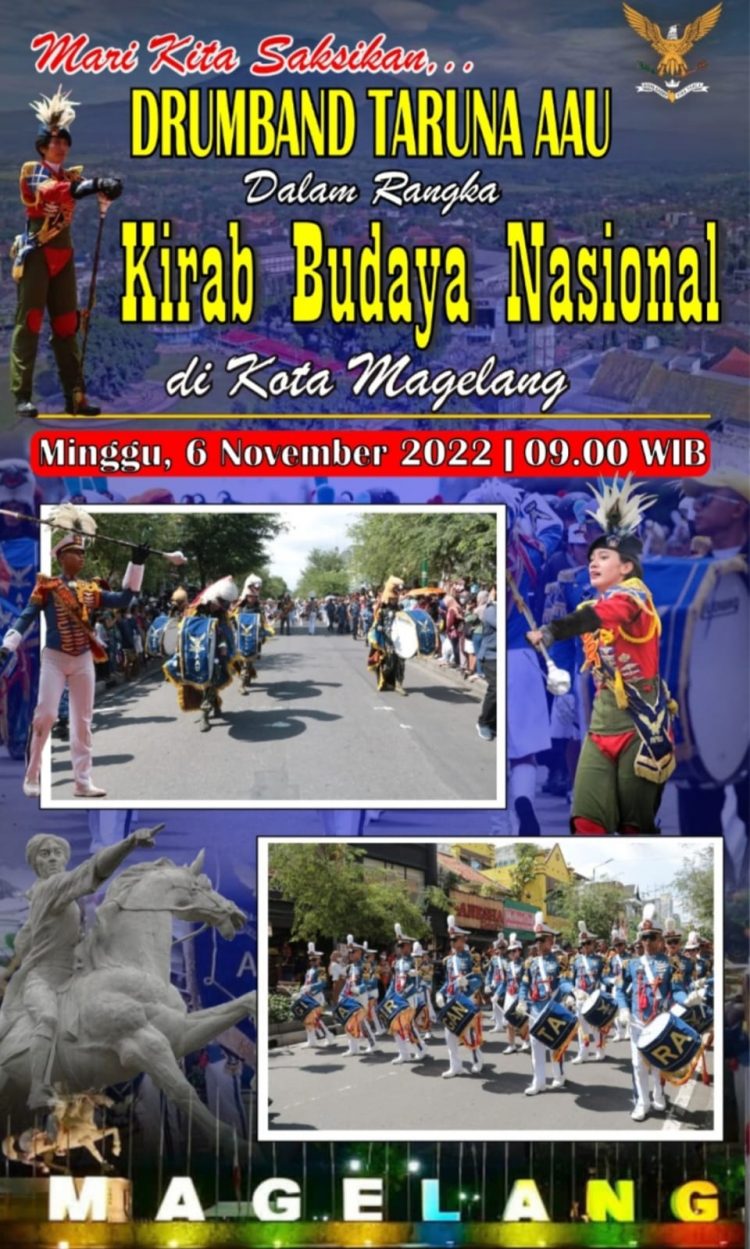 Kirab dan Display Drumband “Gita Dirgantara” akan dilaksanakan di Alun-alun kota Magelang pada hari Minggu tanggal 6 November 2022 dari Pukul 09.00 s.d. 11.00 Wib.